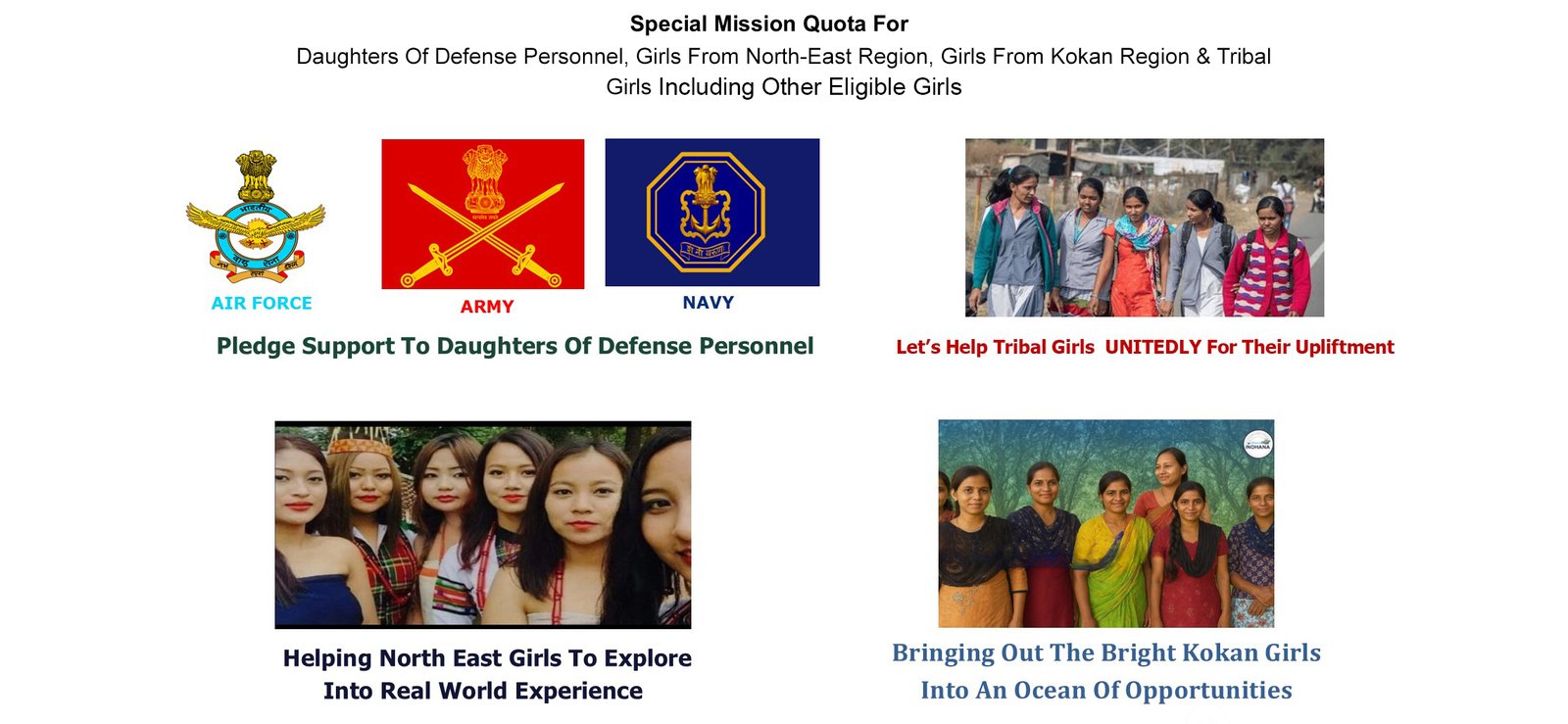 Our Special Mission is for Daughters of Defense Personnel, Girls from North East Region, Girls from Kokan Region & Tribal Girls Including Other Eligible GIRLS*. We request your good self to support this noble mission wholeheartedly.